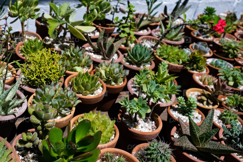 Суккуленты в терракотовых глиняных и бетонных горшках. Коллекция горшечных растений. Продажа растений