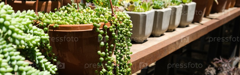 Баннер, Свисающие нити ветвей Senecio rowleyanus. Curio, Asteraceae, ампельное растение, почвопокровное