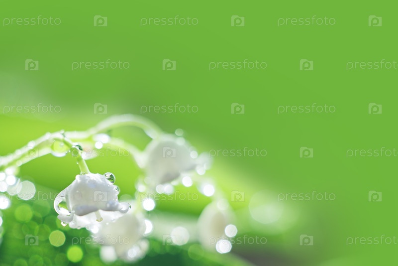 Нежный цветок ландыша с каплями воды, восход солнца крупным планом. селективный фокус, боке, зеленый фон. весенняя концепция