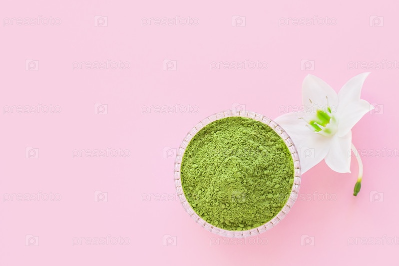 Сухой зеленый порошок матча на розовом фоне для приготовления японского натурального чая