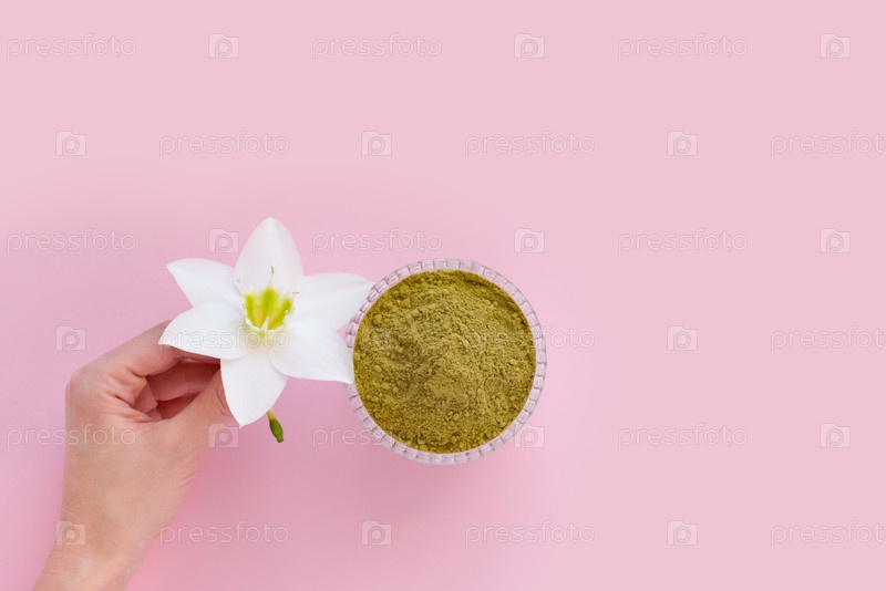 Натуральный порошок хны и белый цветок в женской руке на розовом фоне. Концепция женской красоты и косметологии. Окрашивание бровей и волос