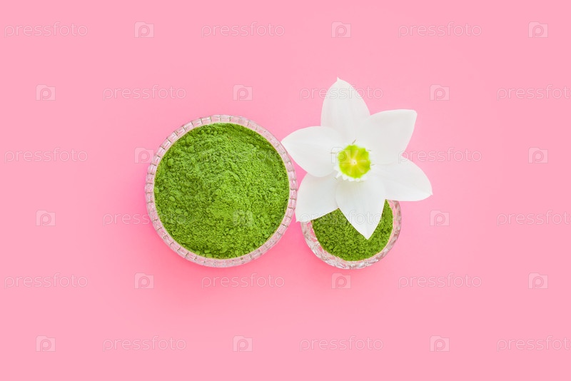 Сухой зеленый порошок матча на розовом фоне для приготовления японского натурального чая