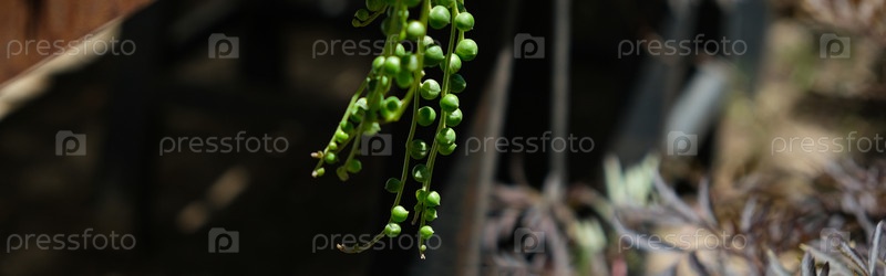 Свисающие нити ветвей Senecio rowleyanus. Curio, Asteraceae, ампельное растение, баннер
