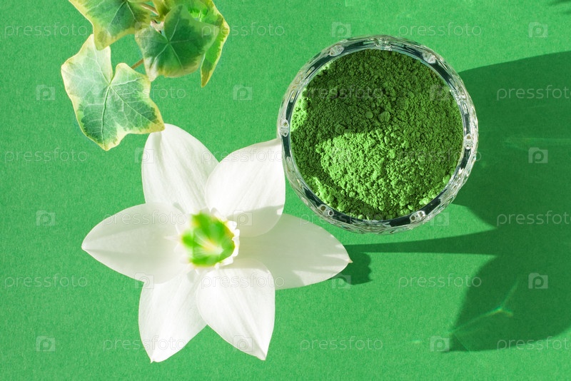 Сухой зеленый порошок матча на розовом фоне для приготовления японского натурального чая