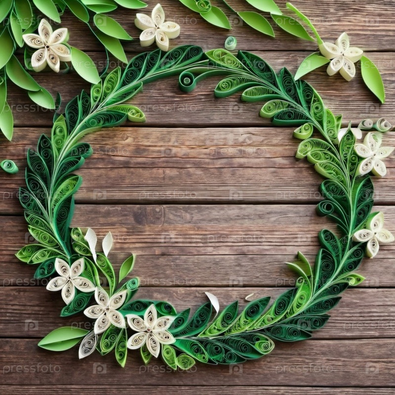 Венок из бумажных цветов, сделанный из зеленой белой бумаги, расположен по кругу на деревянной поверхности. Техника квиллинга, бумага скручивается и формируется для создания цветов и листьев. Место для копирования текста или продукта. AI
