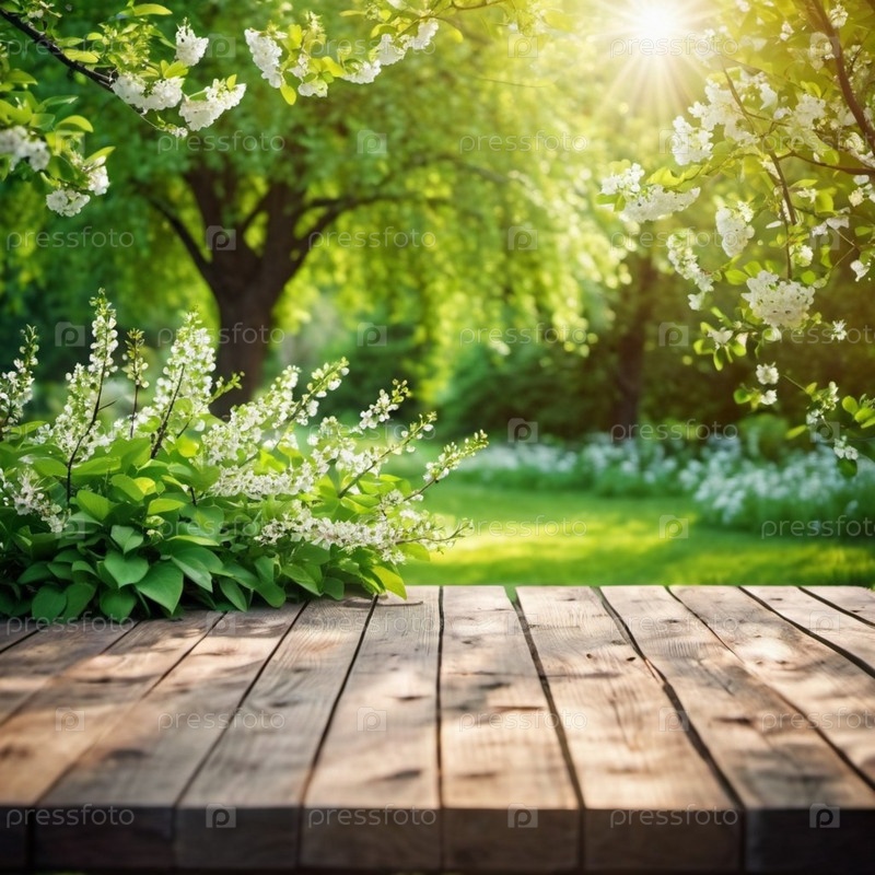 Деревянный стол стоит перед размытым фоном весеннего сада. Белые цветы на ветке тянутся к солнцу, которое светит сквозь листву. Копия пространства для демонстрации продукта. AI