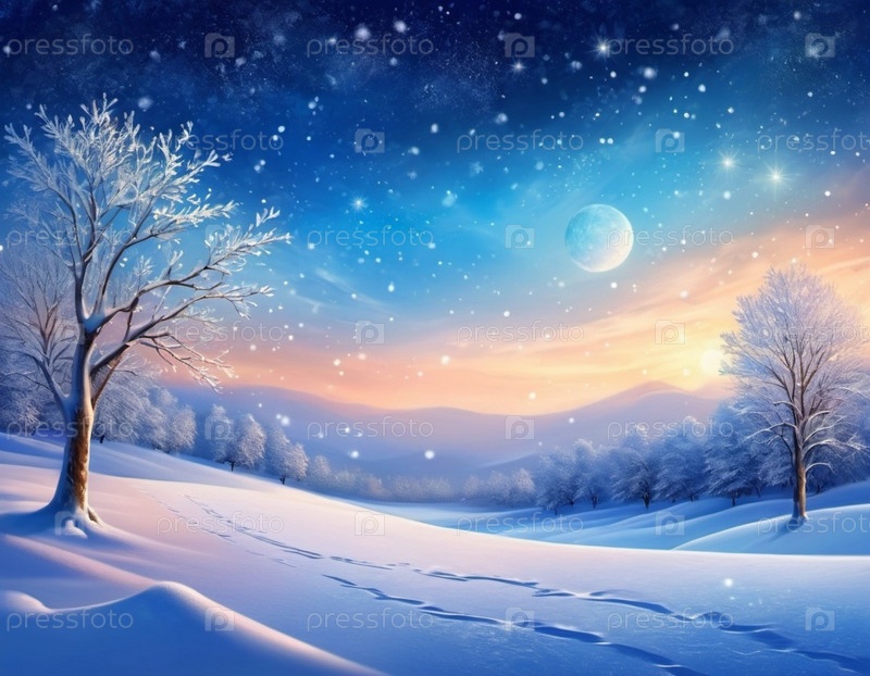 Живописная зимняя сцена с заснеженной равниной и силуэтами деревьев на фоне яркого ночного неба. Мягкий снегопад добавляет волшебный штрих, создавая спокойный и захватывающий дух пейзаж. Сгенерированный ИИ
