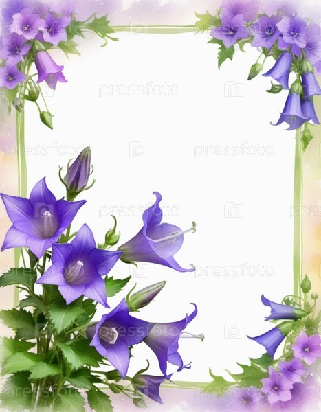 Чистый лист бумаги, окруженный рамкой из фиолетовых или синих колокольчиков. Цветы, расположенные вокруг бумаги, создают естественную красивую границу. Фон или шаблон для различных целей, пространство для копирования