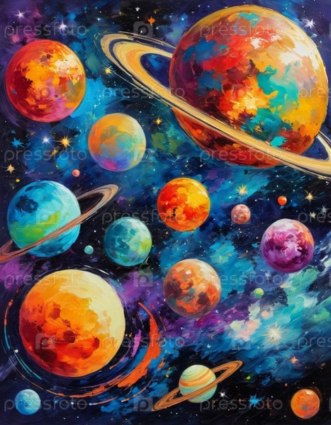 Планетарная система с несколькими планетами, большим ярко окрашенным газовым гигантом и каменистой планетой. Яркие звезды и огромное пространство темного космоса с галактикой на заднем плане. Космические просторы. Космонавтика. ИИ