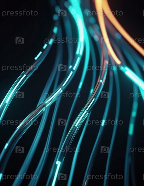 Синие и оранжевые светящиеся провода скручиваются и переплетаются на темном фоне с боке-огнями. Черные кабели и разъемы со светящимися огнями и цепями соединяются, образуя сеть. Создано с помощью ИИ