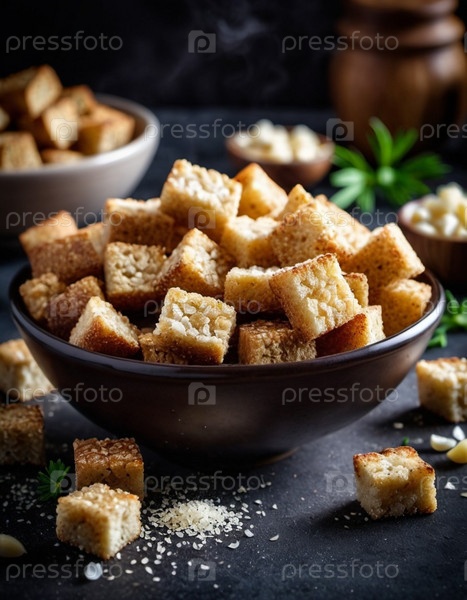 Запеченные ржаные гренки солят и настаивают на чесноке, создавая пикантную закуску, художественно оформленную в глубокой коричневой миске, окруженную. Мягкая начинка. Идеально подходит для супов, салатов или закуски к пиву