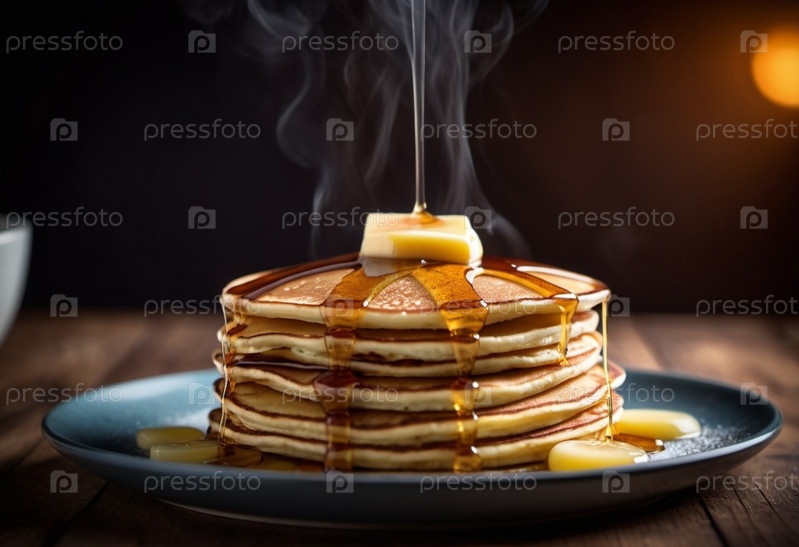 Блины сложены высоко и покрыты щедрой порцией сливочного масла. Сверху поливается теплый медово-кленовый сироп. Притягательный аромат. Ощущение домашнего завтрака. Кухонная сцена. AI