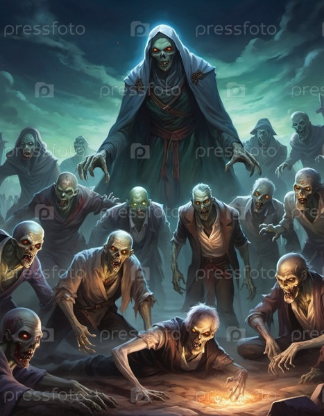 Гротескные зомби появляются из могил, разложившиеся тела освещаются лунным светом. Скелетные фигуры бродят среди надгробий, в то время как другие ползают по земле, демонстрируя свой ужасный вид. ИИ