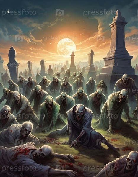 Гротескные зомби появляются из могил, разложившиеся тела освещаются лунным светом. Скелетные фигуры бродят среди надгробий, в то время как другие ползают по земле, демонстрируя свой ужасный вид. ИИ