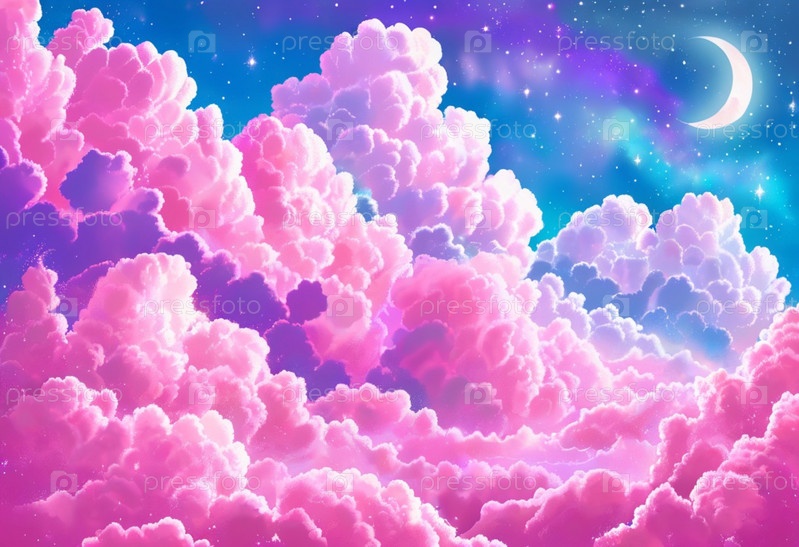 Красивые розовые пушистые облака в ярком закатном небе. Визуальное отображение. Драматическое нереальное небо с кучевыми и слоистыми облаками в атмосфере. Неизвестная планета с розовыми облаками. Луна, планеты и звезды. Искусство ИИ