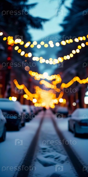 Зима приносит мягкий снегопад на городские улицы, где разноцветные огни висят над головой, создавая теплую и праздничную атмосферу. Эффект боке от огней добавляет причудливый штрих, подчеркивая радость сезона