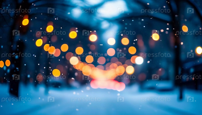 Зима приносит мягкий снегопад на городские улицы, где разноцветные огни висят над головой, создавая теплую и праздничную атмосферу. Эффект боке от огней добавляет причудливый штрих, подчеркивая радость сезона