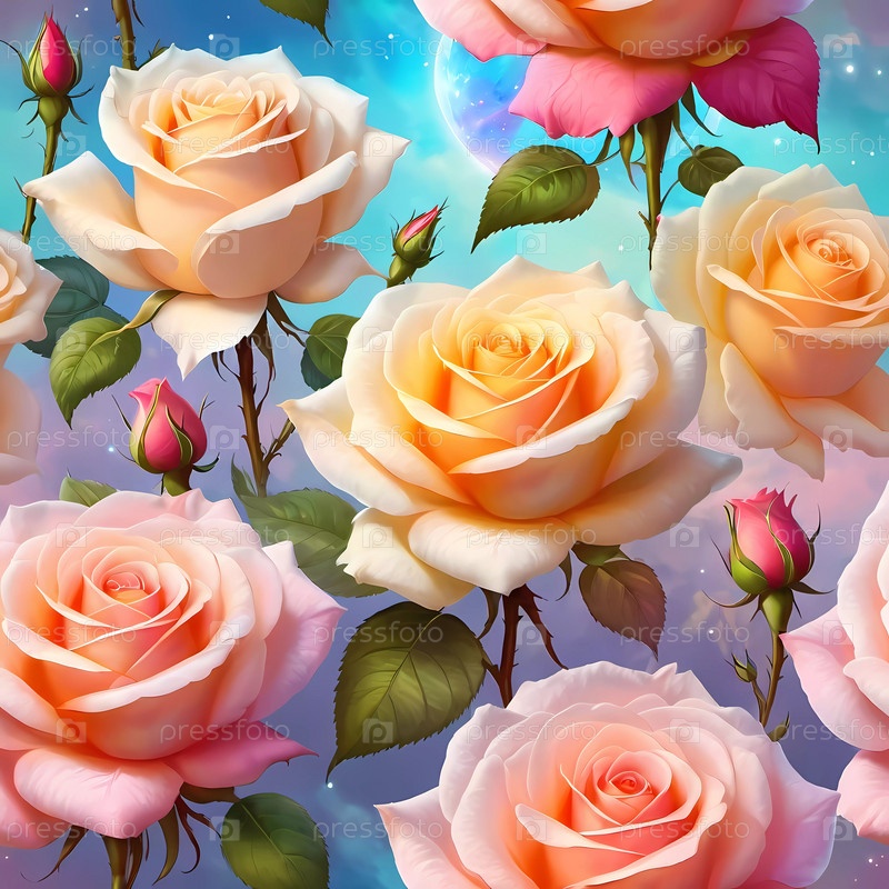 Яркая романтическая картина представляет собой пышную композицию из красиво цветущих роз разных оттенков, запечатлевшую сущность любви и природы в красочной обстановке сада при дневном свете. Генеративный ИИ
