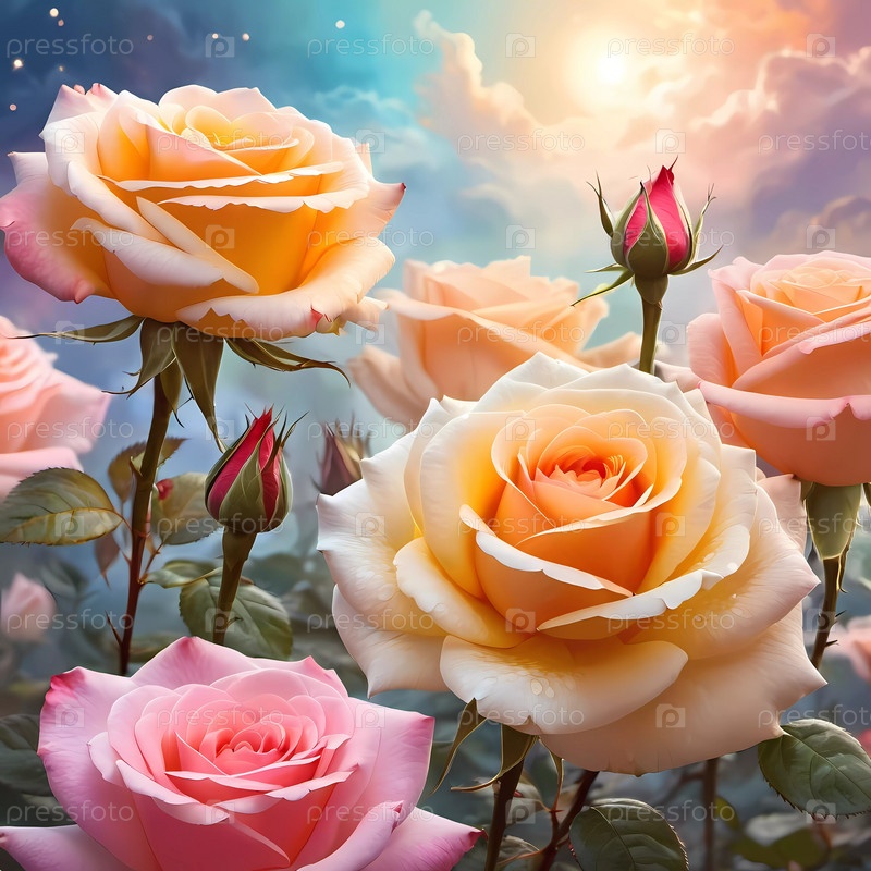 Яркая романтическая картина представляет собой пышную композицию из красиво цветущих роз разных оттенков, запечатлевшую сущность любви и природы в красочной обстановке сада при дневном свете. Генеративный ИИ