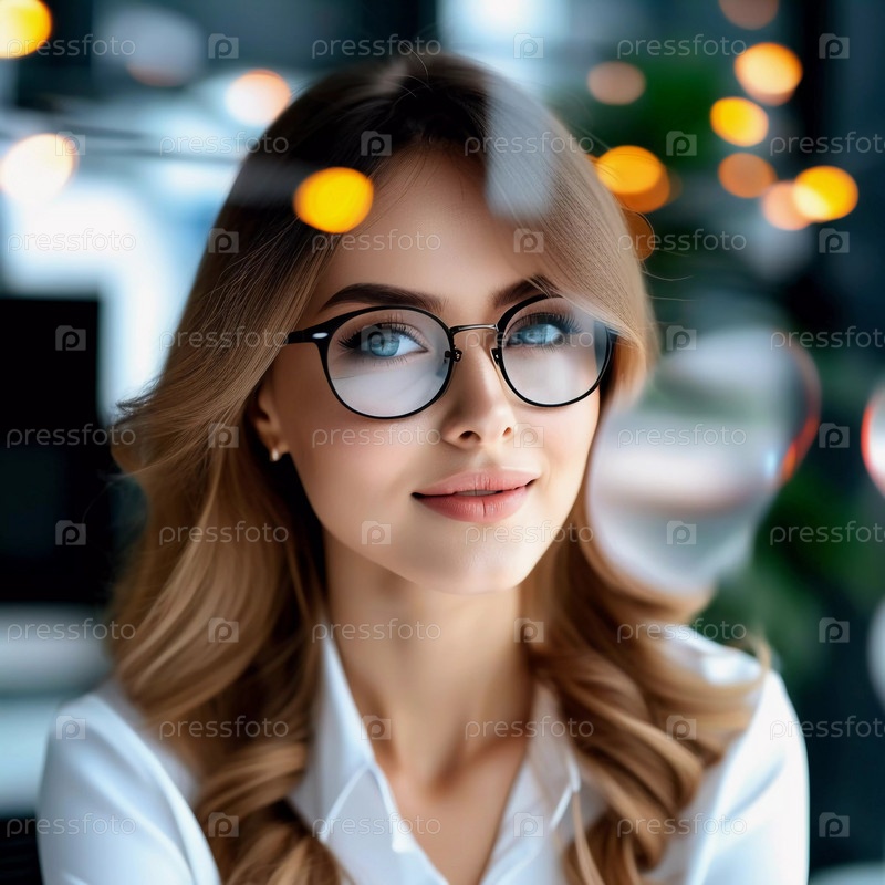 Уверенная в себе азиатская женщина в белой рубашке и очках тепло улыбается в современной офисной обстановке с размытым светом на заднем плане, демонстрируя профессиональную атмосферу. Генеративный ИИ