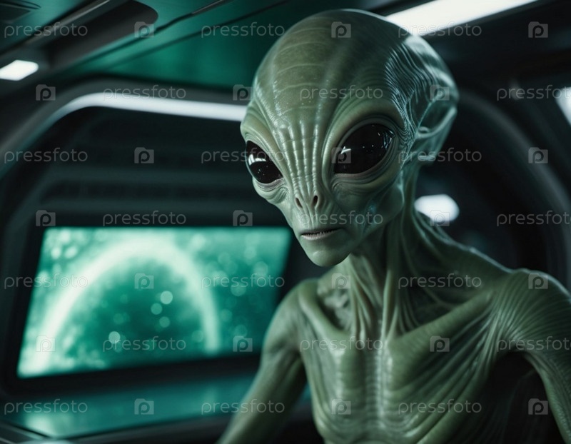 Встреча с инопланетянами в пустоте на борту футуристического космического корабля во время межзвездного путешествия через глубокий космос, раскрывающая таинственное существо. Генеративный ИИ