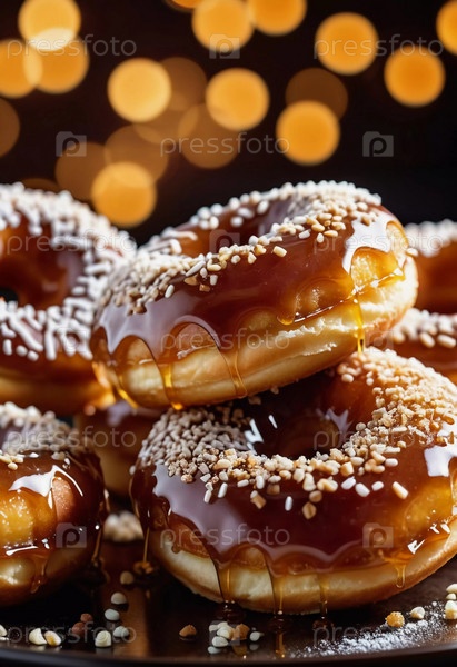 Стопка пончиков с медовой глазурью и глянцевой карамельной глазурью, украшенных хрустящей начинкой, приглашает вас побаловать себя сладким лакомством. Эти пончики идеально подойдут любому любителю десертов. Генеративный ИИ