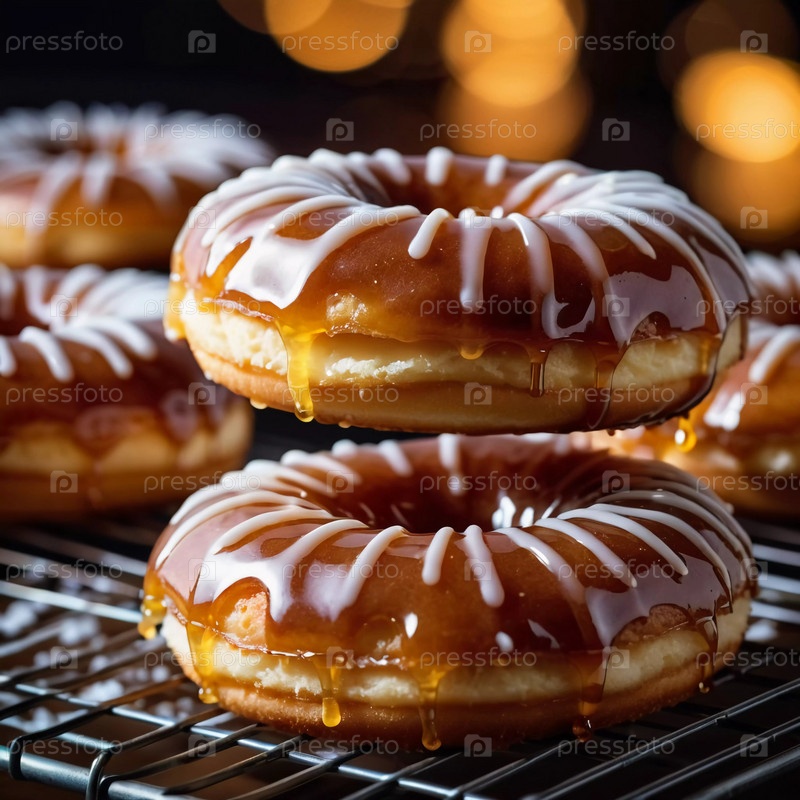 Стопка пончиков с медовой глазурью и глянцевой карамельной глазурью, украшенных хрустящей начинкой, приглашает вас побаловать себя сладким лакомством. Эти пончики идеально подойдут любому любителю десертов. Генеративный ИИ