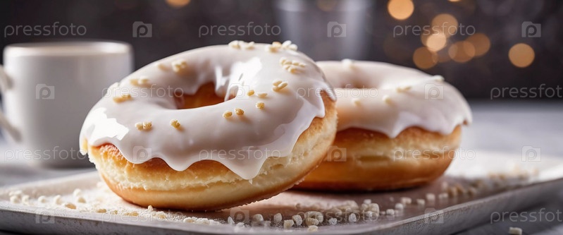 Вкусный ассортимент ванильных пончиков, покрытых кремовой глазурью и разноцветной посыпкой, демонстрирующих свою привлекательную текстуру и сладость в теплой обстановке кафе. Белая глазурь на булочках. Генеративный ИИ