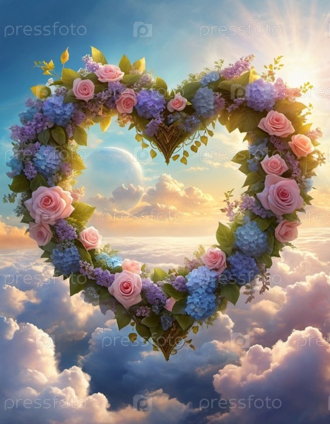 Красивая композиция в форме сердца из красочных цветов парит в небе, окруженная мягкими облаками, когда солнце встает, создавая мирную и романтическую атмосферу. Генеративный ИИ. Печаль