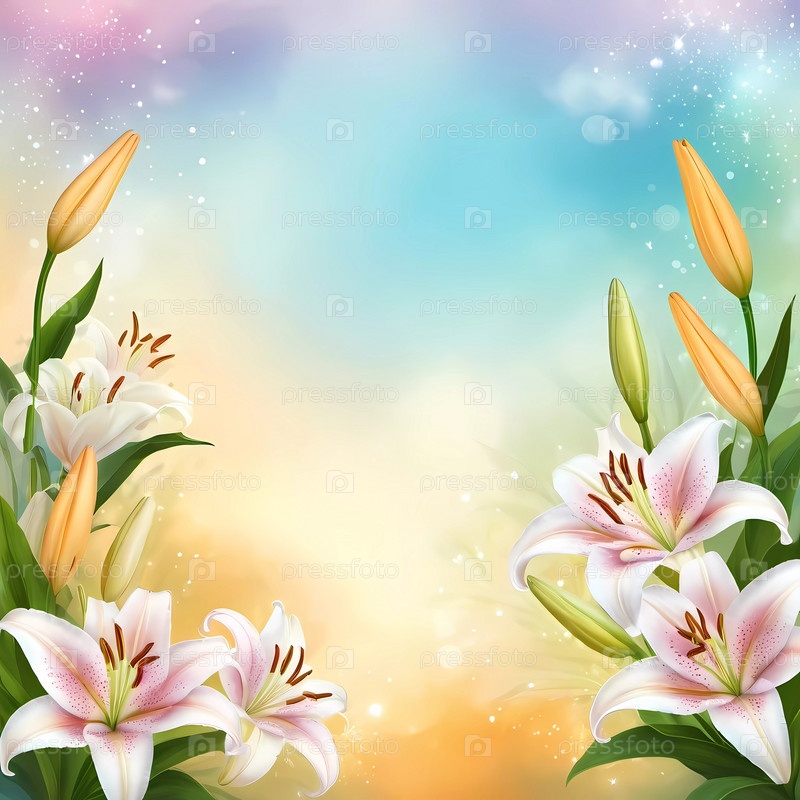 Нежные белые, желтые, оранжевые лилии широко распускают лепестки, обрамленные светящимся сине-зеленым фоном, с мягкими бликами боке и теплыми солнечными лучами, создающими чарующую атмосферу. Генеративный ИИ
