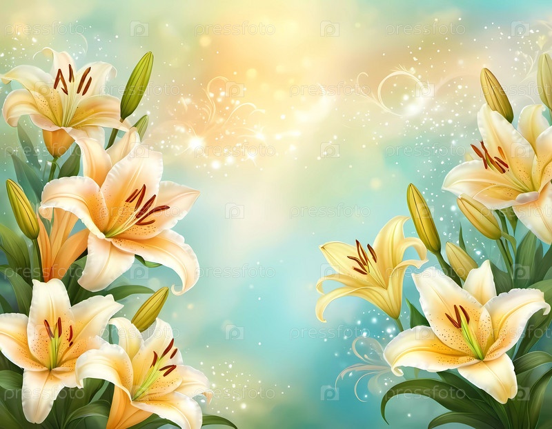 Нежные белые, желтые, оранжевые лилии широко распускают лепестки, обрамленные светящимся сине-зеленым фоном, с мягкими бликами боке и теплыми солнечными лучами, создающими чарующую атмосферу. Генеративный ИИ