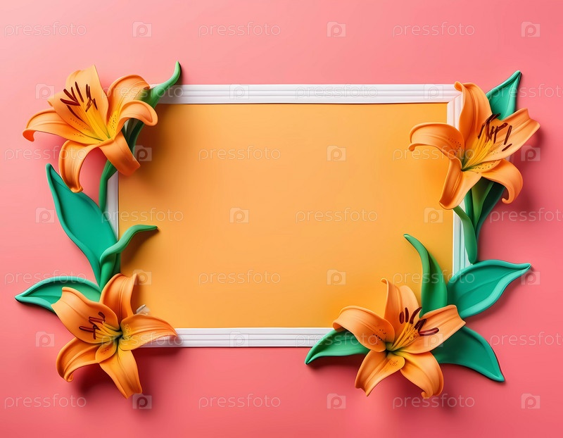Яркие лилии в оттенках оранжевого обрамляют пустую желтую область на розовом фоне, создавая веселую обстановку для творческих проектов или приглашений. Генеративное искусство ИИ. Копировальное пространство, поздравительная открытка