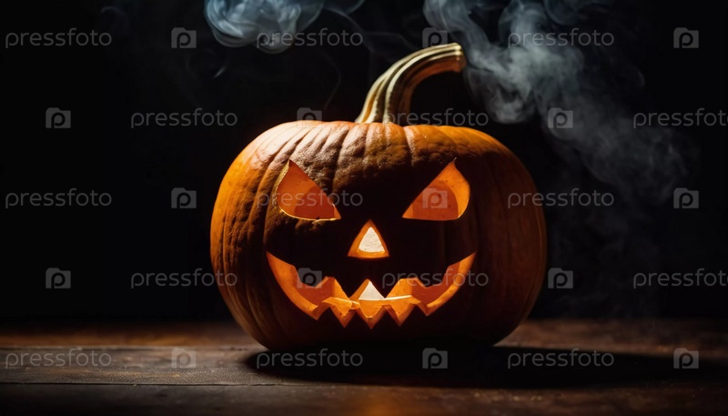 Вырезанная тыква на Хэллоуин имеет угрожающее лицо, подсвеченное изнутри, с дымом, поднимающимся вверх, что усиливает тревожную атмосферу вечера. Генеративный ИИ