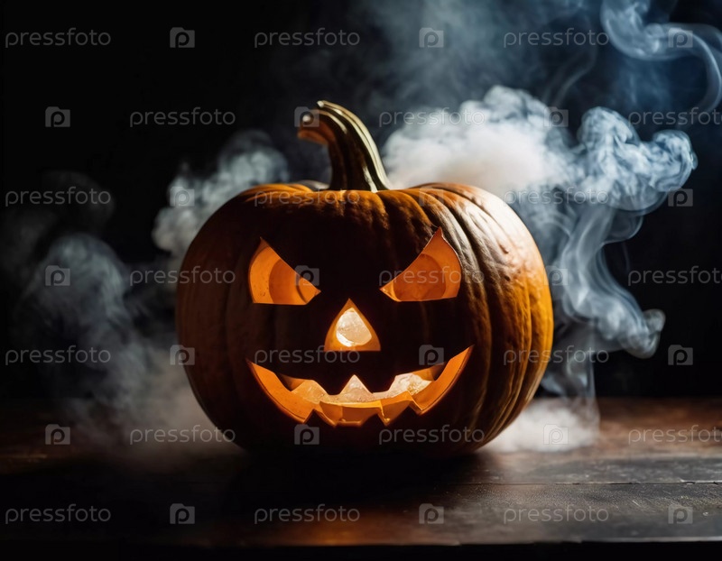 Вырезанная тыква на Хэллоуин имеет угрожающее лицо, подсвеченное изнутри, с дымом, поднимающимся вверх, что усиливает тревожную атмосферу вечера. Генеративный ИИ