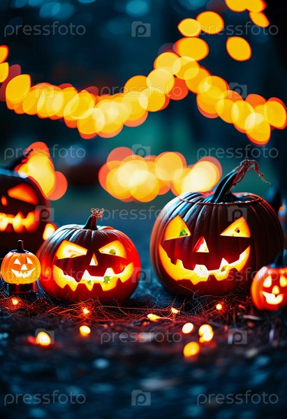 В этот Хэллоуин резная тыква излучает теплое свечение, окруженная маленькими тыквами и красочными осенними листьями, а на заднем плане мерцают праздничные огни. Генеративный ИИ