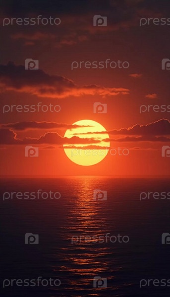 Потрясающий восход солнца омывает океан ярким красным светом, а облака отражают цвета над ним. Волны мягко омывают берег, создавая умиротворяющую атмосферу на рассвете. Влажная дымка над водой. Генеративный ИИ