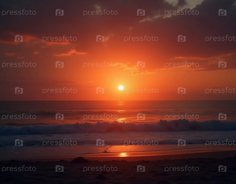 Потрясающий восход солнца омывает океан ярким красным светом, а облака отражают цвета над ним. Волны мягко омывают берег, создавая умиротворяющую атмосферу на рассвете. Влажная дымка над водой. Генеративный ИИ