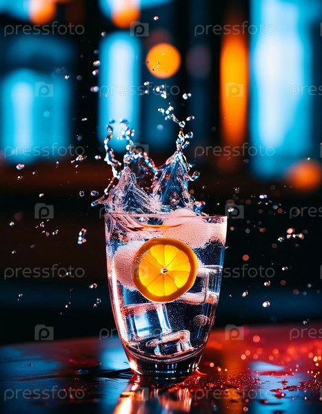 Стакан переполняется водой, а лед и долька лимона создают брызги, освещенные цветными огнями в оживленной атмосфере бара. Генеративный ИИ