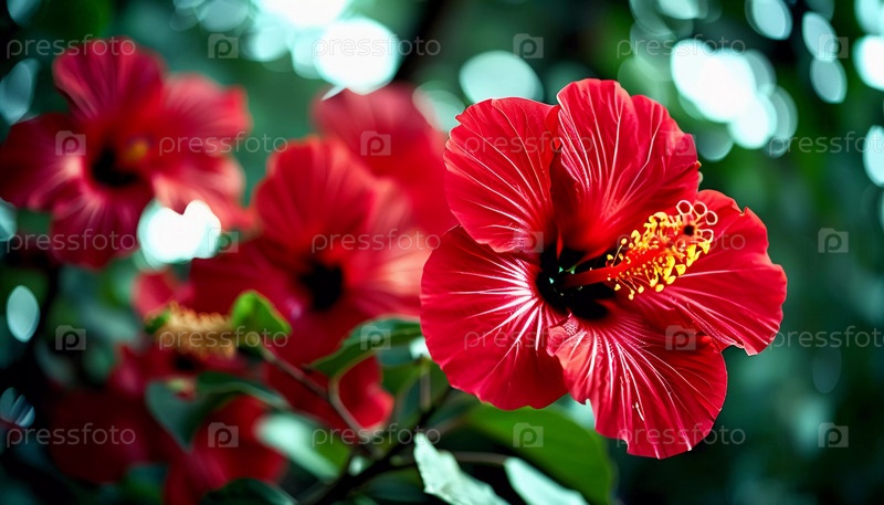 Ярко-красные цветы гибискуса демонстрируют замысловатые лепестки в цветущем саду. Пышная зелень создает яркий фон для их красоты. Гибискус — крупный род растений семейства Мальвовые. AI