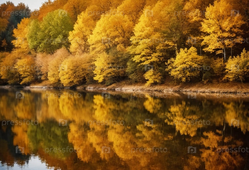 Яркие желтые листья создают потрясающую осеннюю картину вокруг спокойного озера, а отражения отражают листву на поверхности воды, когда день подходит к концу. Генеративный ИИ