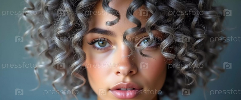 Поразительный крупный план показывает роскошные седые пепельные локоны, сверкающие блеском. Мягкие волны элегантно ниспадают, подчеркивая текстуру и красоту волос в мягком естественном свете. Генеративный ИИ