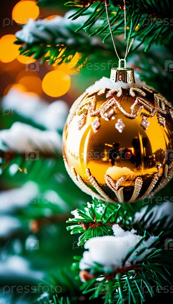Сверкающие шары для украшений в ярком золоте свисают с пышной еловой ветки. Мягкие, теплые огни мерцают, усиливая праздничный дух Рождества. С Новым годом. Анаморфное боке. Генеративный ИИ