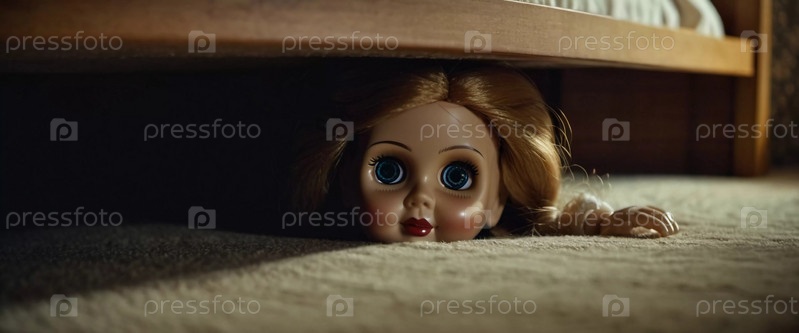 Тревожная старая кукла с тревожными глазами и в винтажной одежде выглядывает из-под ретро-кровати, вызывая жуткое чувство в тускло освещенном пространстве. Страшная кукла для ужасов и Хэллоуина. Генеративный ИИ