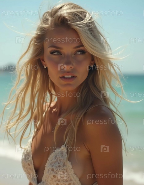 Блондинка в купальнике смотрит назад, стоя у береговой линии. Нежные морские волны плещутся у ее ног под ясным голубым небом. Длинные волосы, красивое молодое лицо. Реклама путешествий и одежды. AI