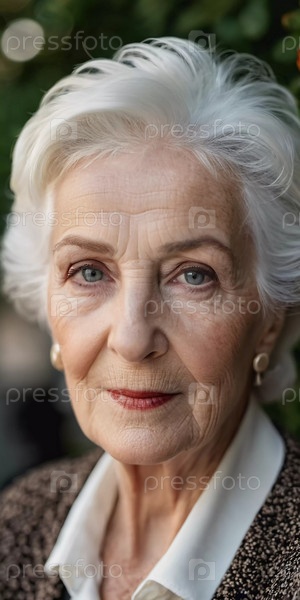 Утонченная пожилая француженка на открытом воздухе. Манера поведения раскрывает жизненный опыт и размышления, воплощая изящество и мудрость. Ухоженная женщина 70 лет с седыми волосами. AI