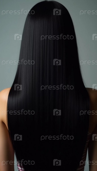 Гладкие, прямые черные волосы элегантно струятся по спине, подчеркивая их здоровый блеск и равномерный цвет, освещенные мягким освещением, создавая эффектный образ. Уход за волосами, эффект косметики. AI