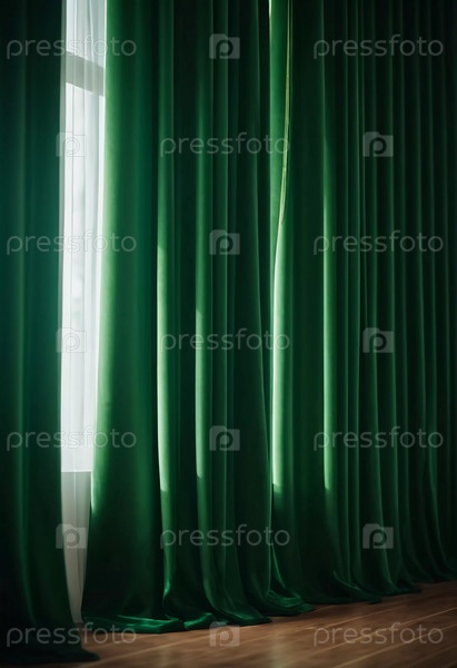 Штора с мягкими плавными струящимися складками. Глубокий зеленый цвет и роскошная фактура создают драматичную и элегантную атмосферу. Декор и дизайн интерьера. Дорогая штора из богатой ткани. AI