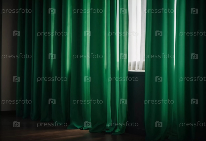 Штора с мягкими плавными струящимися складками. Глубокий зеленый цвет и роскошная фактура создают драматичную и элегантную атмосферу. Декор и дизайн интерьера. Дорогая штора из богатой ткани. AI