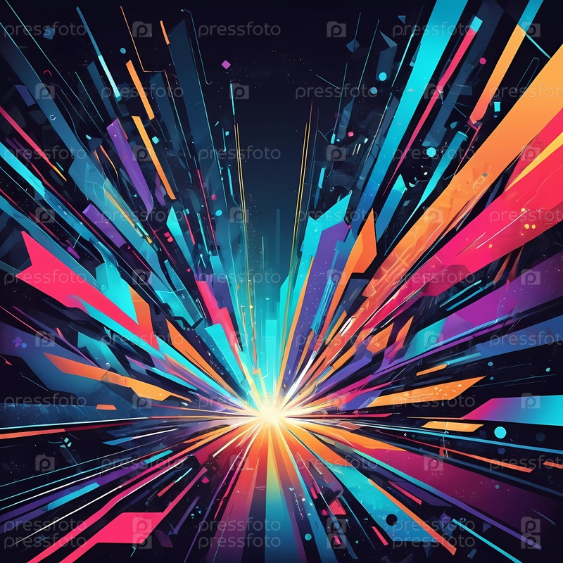 Цифровое произведение искусства изображает взрыв цветов и форм, представляющих передовые технологии и инновации. Оно иллюстрирует сочетание тем больших данных и искусственного интеллекта. Генеративный ИИ