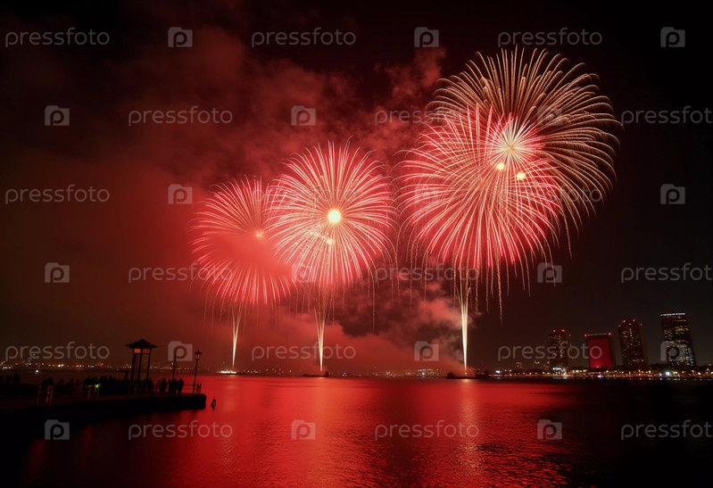 Яркие красные и золотые фейерверки взрываются на фоне темного неба, отражаясь в водном пути. Празднование освещает городской горизонт во время праздничного ночного мероприятия. Генеративный ИИ